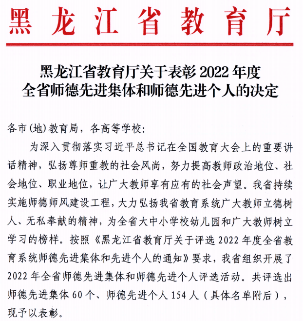 近日,黑龙江省教育厅下发《关于表彰2022年度全省师德先进集体和师德先进个人的决定》,我校林学院森林资源可持续经营团队荣获“黑龙江省2022年度师德先进集体”、园林学院李彦雪老师荣获“黑龙江省2022年度师德先进个人”。