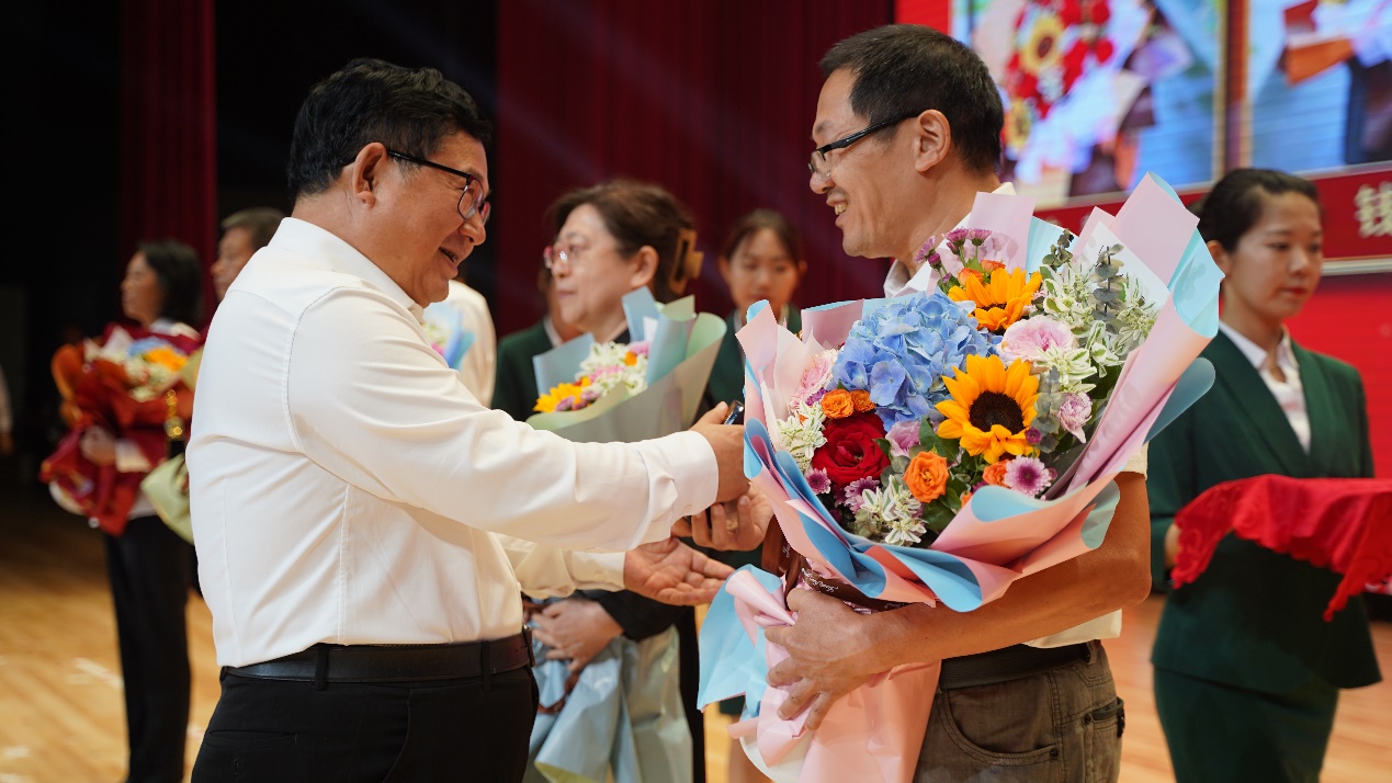 截至2023年7月,我校从教30年教师共33人。他们长期在教学一线默默耕耘,深受广大师生的敬重与爱戴。2023年,我校共有122名新入职教师,他们已经或即将步入教师队伍。活动现场,新入职教师为从教30年老教师代表送上鲜花。