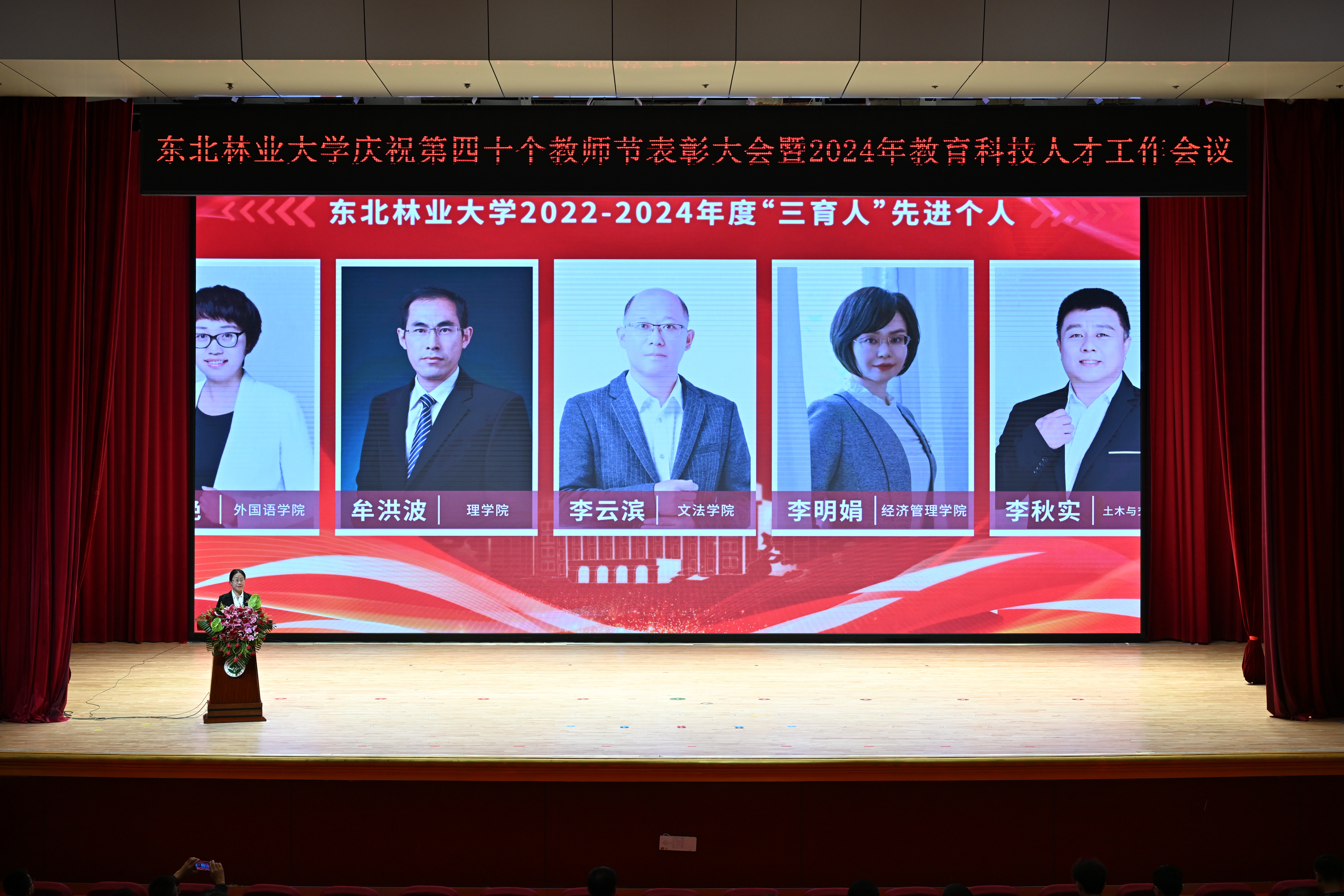 学校党委常委、副校长刘守新宣读《东北林业大学关于2022、2023年度成栋科技奖的评选结果》。学校党委常委、副校长李明泽宣读《东北林业大学关于2022、2023年度成栋伯乐奖的评选结果》。学校党委副书记、纪委书记宋吉红宣读《中共东北林业大学委员会关于表彰2022—2024年度“三育人”先进个人的决定》。