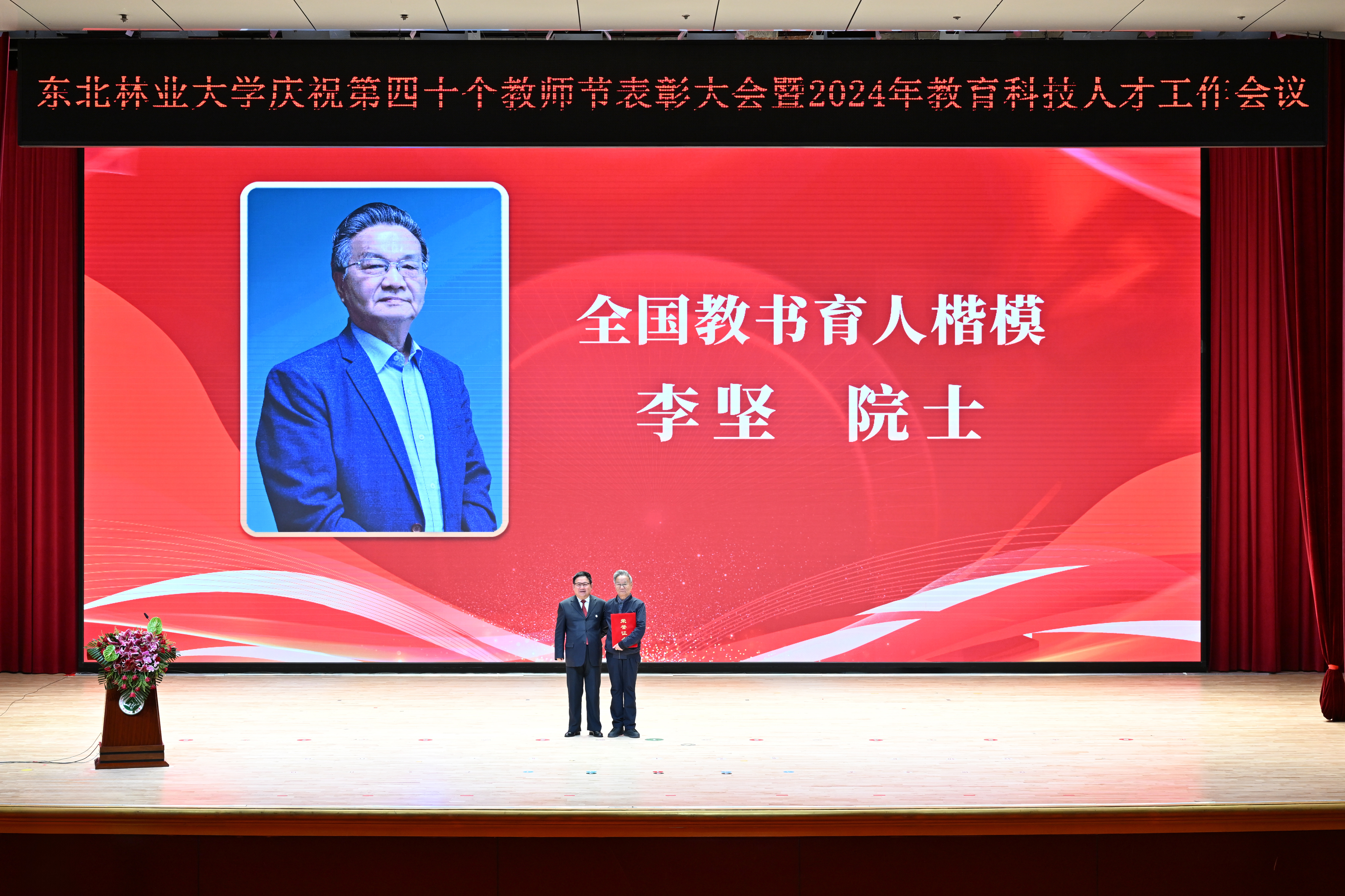 党委书记张志坤为全国教书育人楷模李坚院士、全国模范教师崔晓阳教授、全国教育系统先进工作者赵修华教授颁奖。