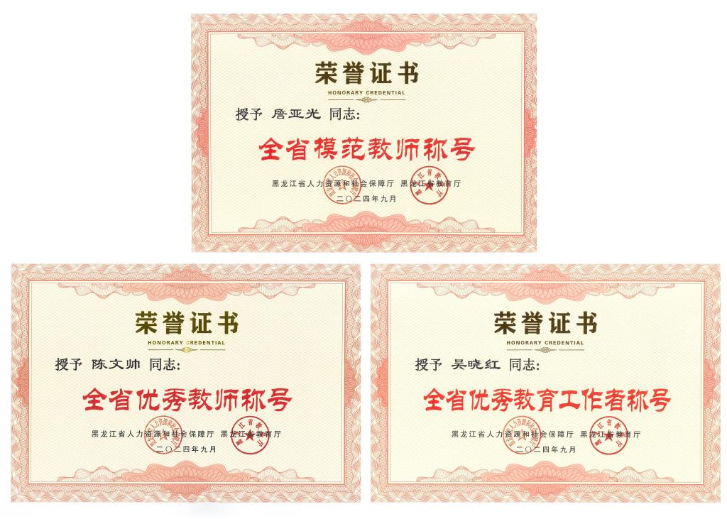为庆祝新中国成立75周年和第40个教师节,进一步增强全省广大教师及教育工作者的荣誉感和责任感,黑龙江省人力资源和社会保障厅、黑龙江省教育厅组织开展了2024年全省教育系统先进集体和先进个人评选表彰活动,我校生命科学学院詹亚光教授被授予“全省模范教师”荣誉称号,材料科学与工程学院陈文帅教授被授予“全省优秀教师”荣誉称号,机电工程学院吴晓红副教授被授予“全省优秀教育工作者”荣誉称号。