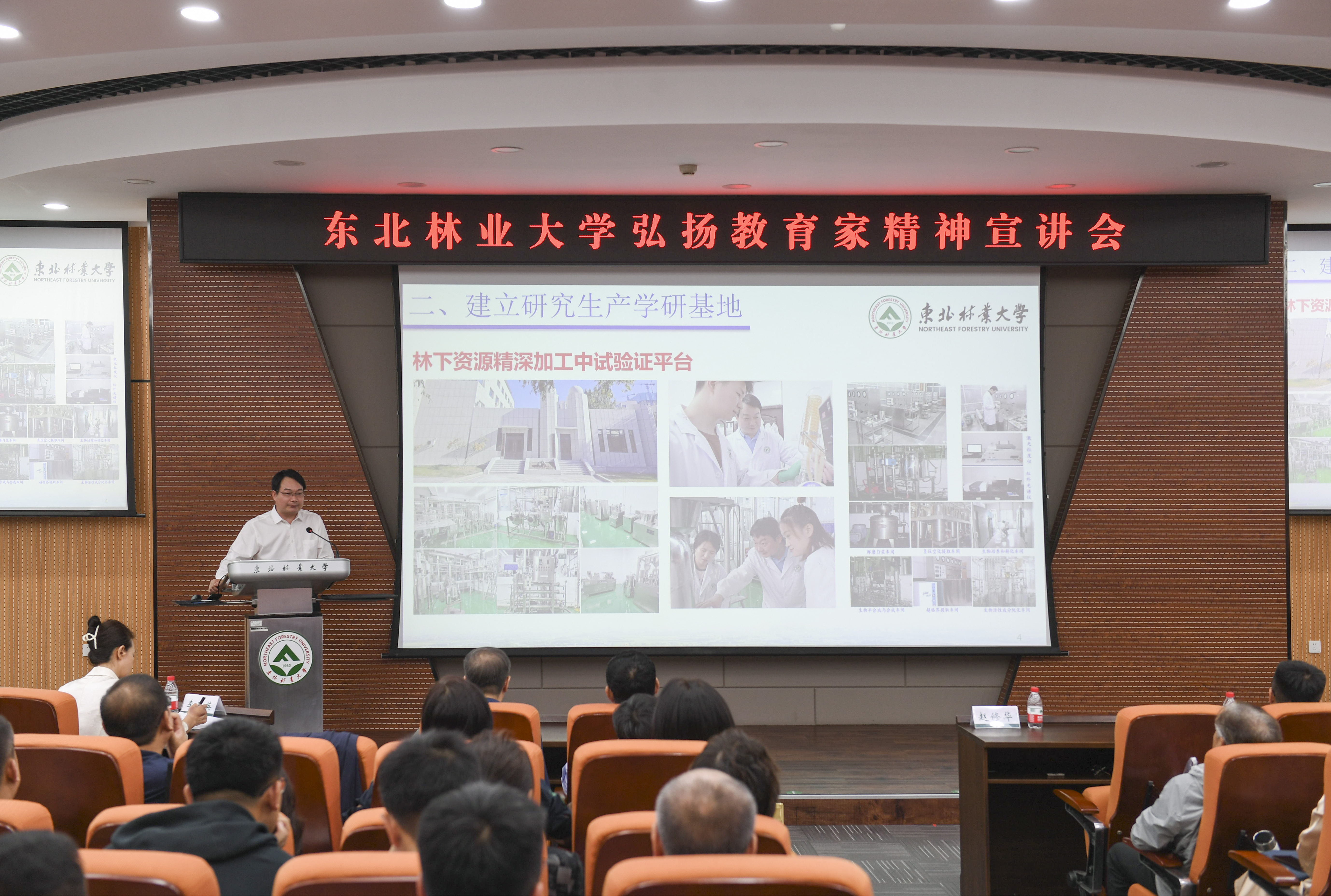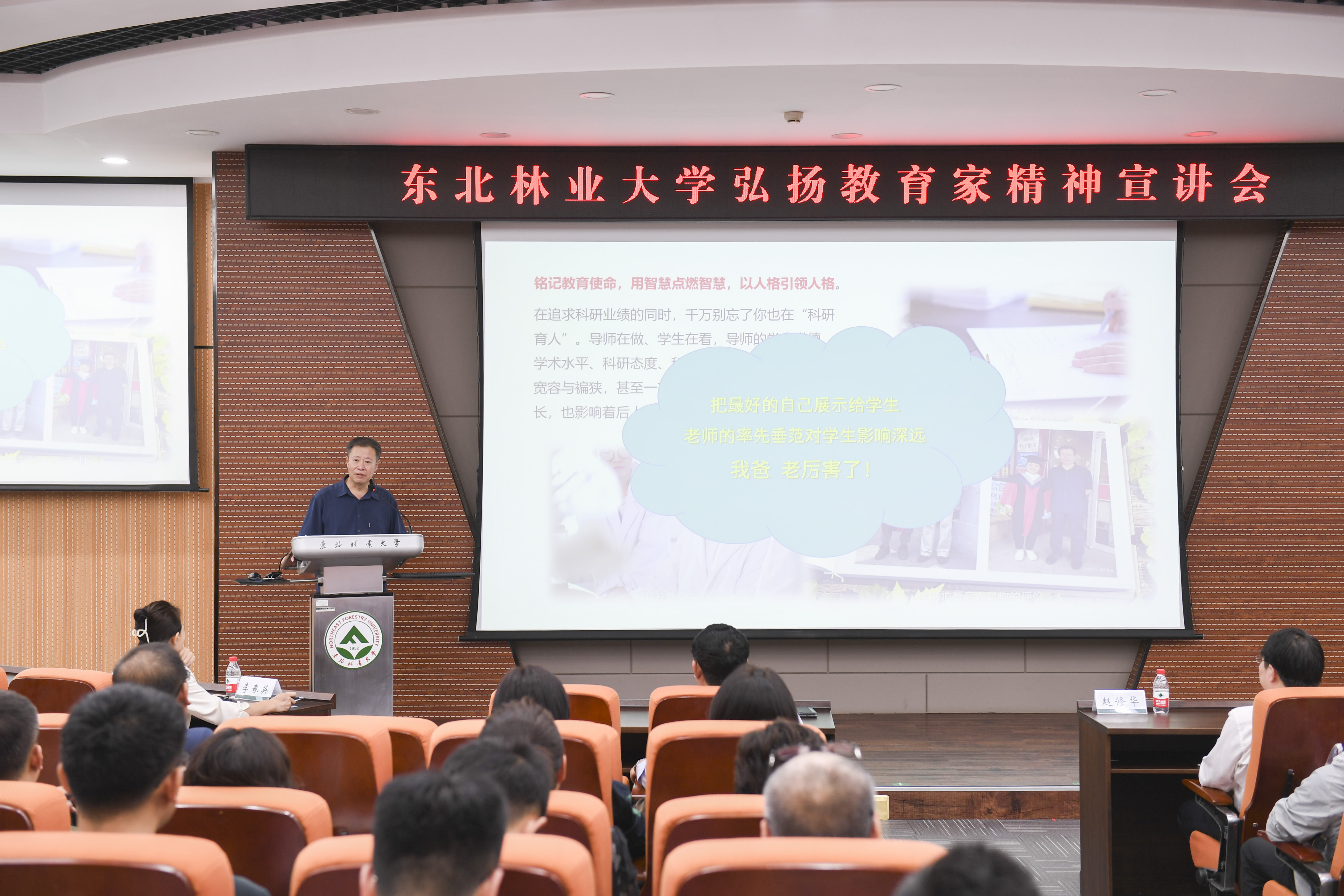 林学院森林土壤学和生态学教授、博士生导师、学科带头人崔晓阳,化学化工与资源利用学院教授、博士生导师、森林植物生态学教育部重点实验室主任赵修华,国家级高层次人才入选者、野生动物与自然保护地学院副院长、教授、博士生导师杨仕隆等三位老师做了精彩宣讲。他们结合一线教育教学经历,讲述了自己躬耕教坛、立志报国的教育故事,展现了东林教师修身治学、树木树人的生动实践,一个个生动的案例、一句句感人的话语令人深受感动和教育,为老师们带来了丰盛的精神食粮。