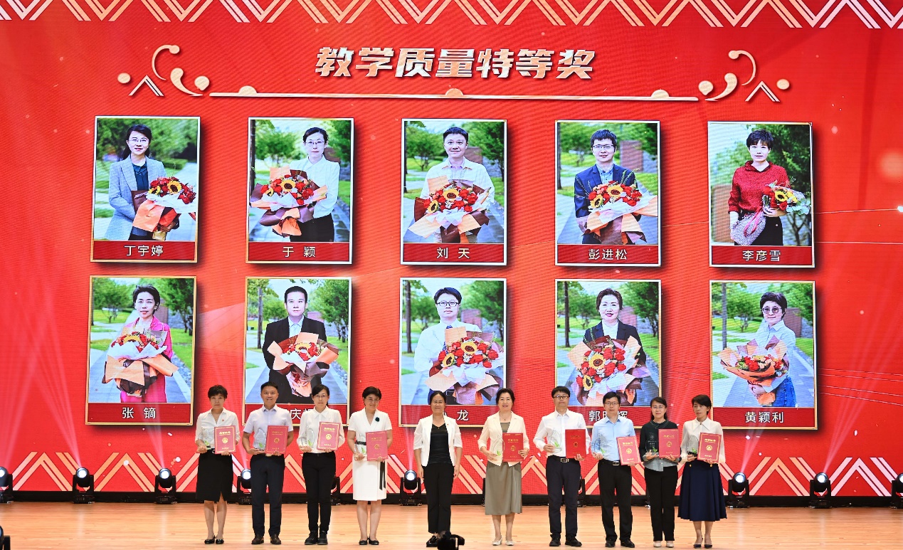 校领导依次为获奖个人和集体颁奖。宋吉红颁发“教学质量特等奖”;翟雪峰颁发“教学改革先锋奖”“十佳本科生导师奖”;刘守新颁发“十佳研究生导师奖”;孙猛颁发“优秀基层教学组织颁奖”;陈文慧颁发“研究生‘五好’导学团队奖”;李顺龙为获得师德先进个人颁奖;宋文龙为获奖的师德师风建设先进集体颁奖。