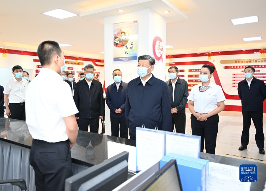 7月12日至15日,中共中央总书记、国家主席、中央军委主席习近平在新疆考察。这是13日上午,习近平在乌鲁木齐市天山区固原巷社区党群服务中心大厅,同工作人员亲切交流。新华社记者 谢环驰 摄