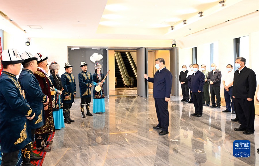 7月12日至15日,中共中央总书记、国家主席、中央军委主席习近平在新疆考察。这是13日上午,习近平在乌鲁木齐市新疆维吾尔自治区博物馆,同《玛纳斯》非物质文化遗产传承人在一起。新华社记者 谢环驰 摄