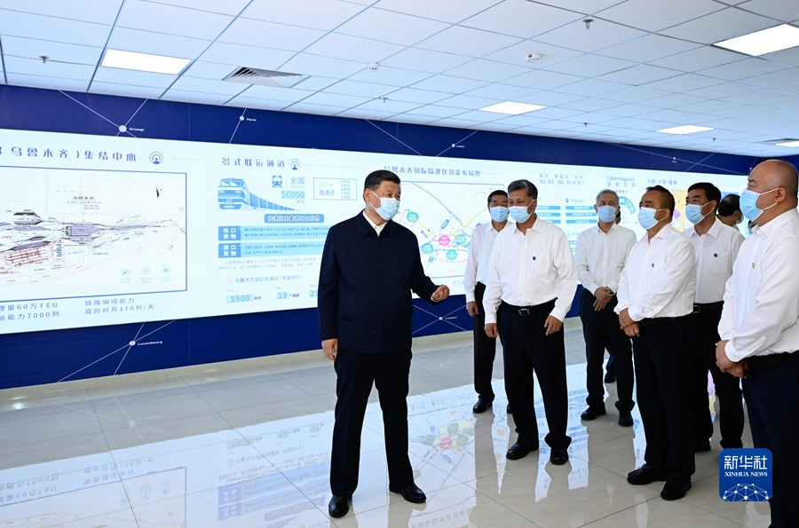 随后,习近平来到乌鲁木齐国际陆港区,听取有关情况介绍,通过实时画面察看中欧班列(乌鲁木齐)集结中心各功能区和阿拉山口口岸、霍尔果斯口岸现场作业情况,并同铁路货运窗口工作人员及现场办事人员亲切交流。习近平强调,随着我国扩大对外开放、西部大开发、共建“一带一路”等深入推进,新疆从相对封闭的内陆变成对外开放的前沿,要推进丝绸之路经济带核心区建设,把新疆的区域性开放战略纳入国家向西开放的总体布局中,创新开放型经济体制,加快建设对外开放大通道,更好利用国际国内两个市场、两种资源,积极服务和融入新发展格局。习近平叮嘱当地负责同志,要坚持“外防输入、内防反弹”,坚持“动态清零”,防疫工作要力求精准、力求方便群众。