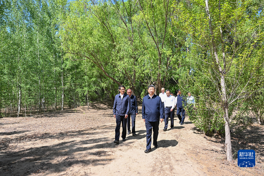 6月5日至6日,中共中央总书记、国家主席、中央军委主席习近平在内蒙古巴彦淖尔考察,并主持召开加强荒漠化综合防治和推进“三北”等重点生态工程建设座谈会。这是6日上午,习近平在临河区国营新华林场考察。新华社记者 谢环驰 摄