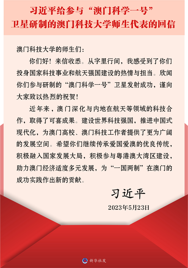 你们好!来信收悉。从字里行间,我感受到了你们投身国家科技事业和航天强国建设的热情与担当。欣闻你们参与研制的“澳门科学一号”卫星发射成功,谨向大家致以热烈的祝贺!